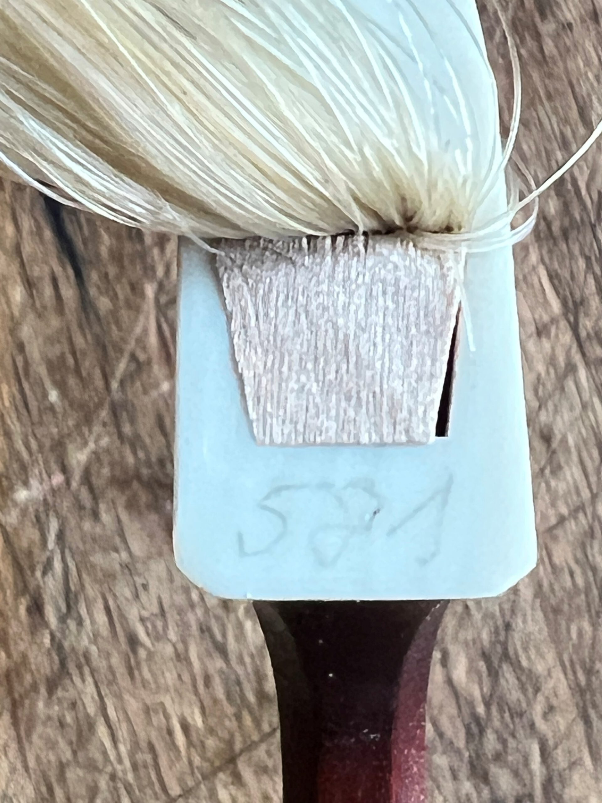 am Ende der Stange auf der Unterseite gelasert: GERMANY, graues „Hammerschlag“ Perlmutter, (die Bilder des Bogens sind typähnlich 581). Unter dem Haar, vor dem Kopfkeil steht möglicherweise die Nummer 580 (Bleistift)