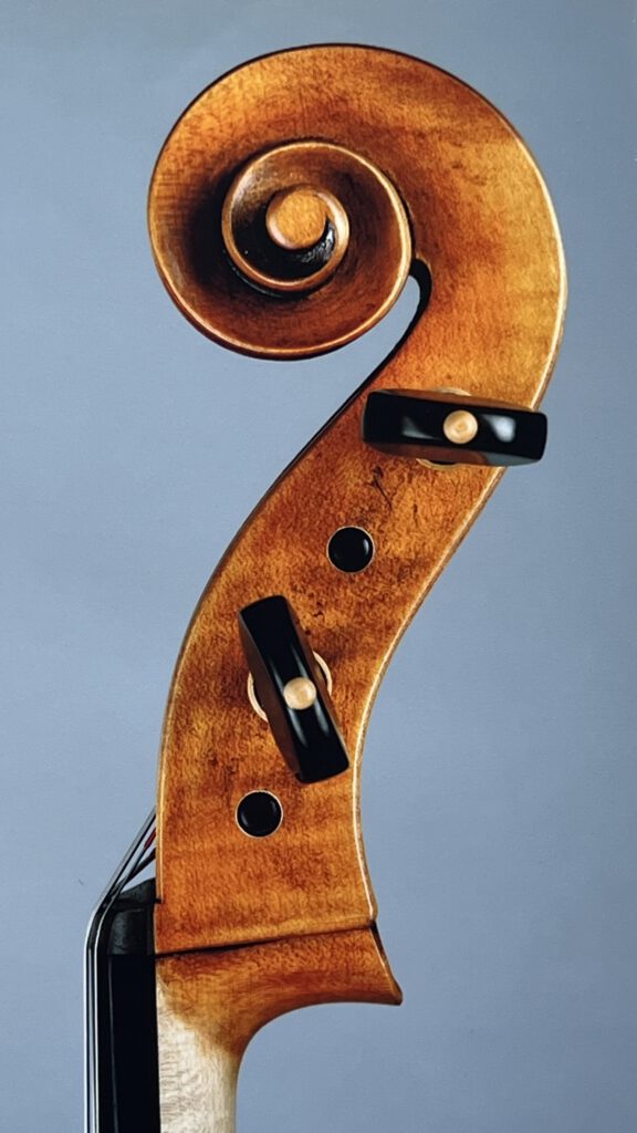 Der Saitenhalter ist aus Ebenholz von „Bois d‘Harmonie), die Saiten „Larsen Cannone warm & broad“), ein belgisches Stegmodell, MiloStamm (Stempel nicht mehr sichtbar).